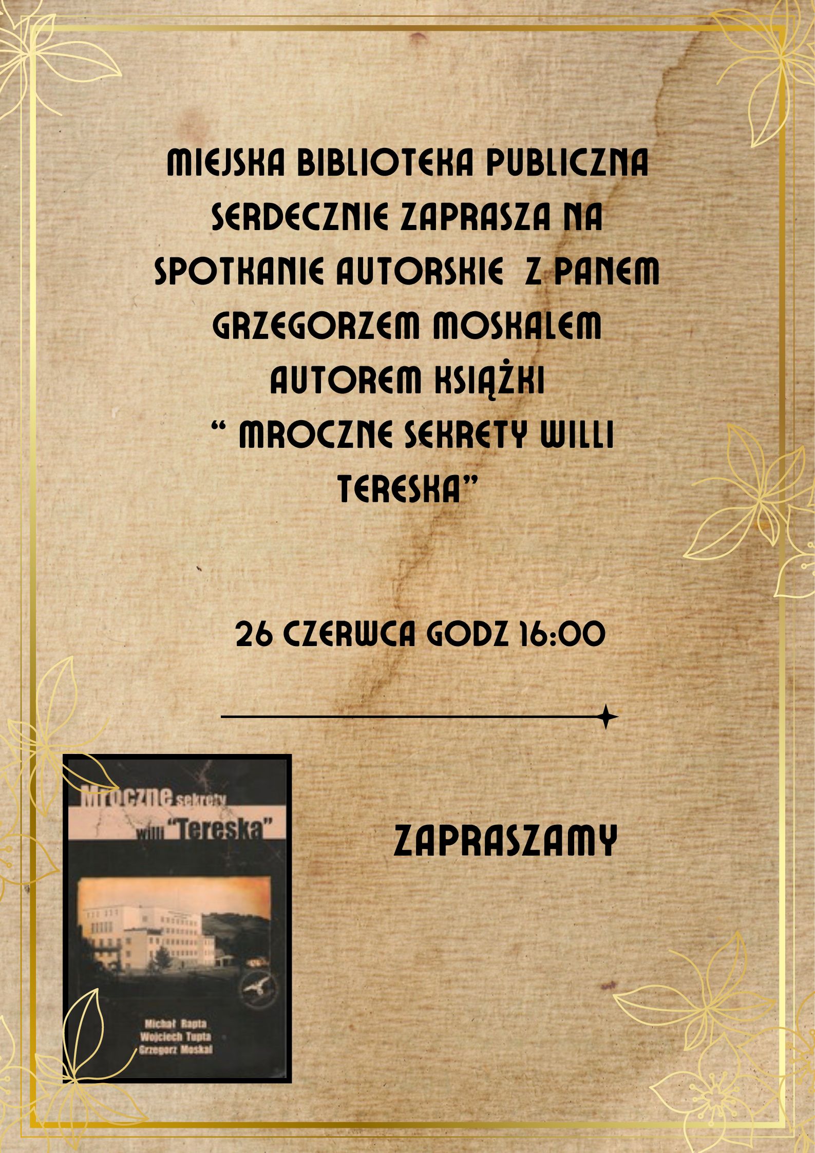 Miejska Biblioteka Publiczna zaprasza na spotkanie autorskie z Panem Grzegorzem Moskalem autorem książki Mroczne sekrety willi ”Tereska”, które odbędzie się 26.06.2024r. o godz. 16:00 Zapraszamy