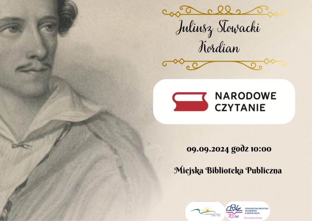 Miejska Biblioteka Publiczna w Rabce-Zdroju oraz Pedagogiczna Biblioteka Wojewódzka w Nowym Sączu Filia w Rabce-Zdroju serdecznie zapraszają na spotkanie przy lekturze Juliusza Słowackiego „Kordian” podczas Narodowego Czytania 2024.