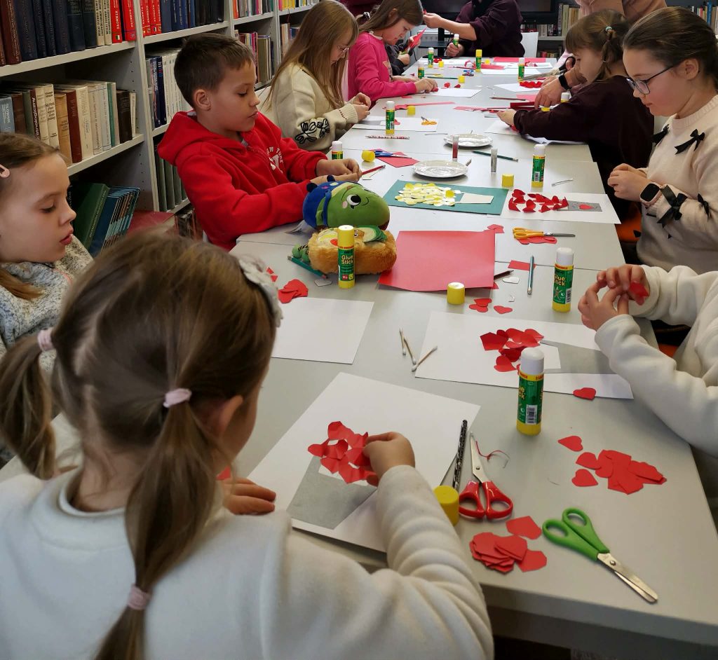 W minionym tygodniu 09 lutego zajęcia otworzył Teatrzyk Kamishibai podczas którego odczytana była znana wszystkim dzieciom bajka o „Czerwonym Kapturku” , następnie na zajęciach plastycznych wykonywane były walentynkowe zakładki, ozdabiane serduszkowymi elementami, brokatowymi dodatkami.